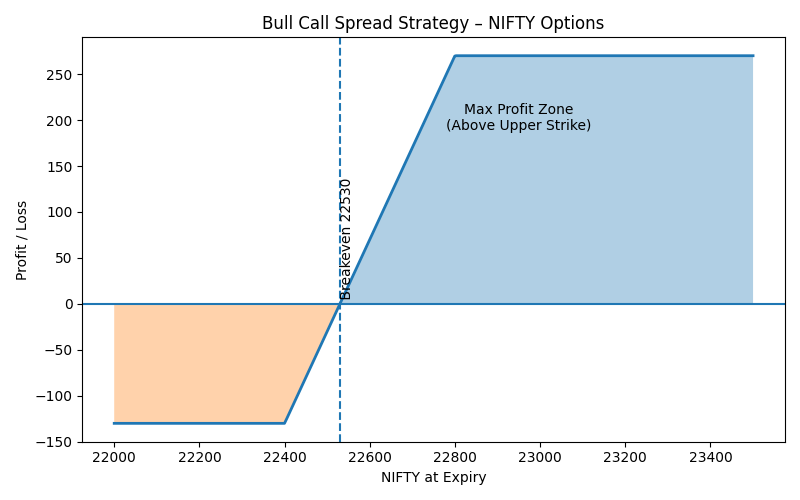 The Bull Call Spread option strategy is designed for traders who expect NIFTY to move higher, but not aggressively. Instead of betting on a strong breakout, this strategy focuses on controlled upside with lower cost and defined risk. It is especially useful for traders who struggle with time decay while buying naked call options.